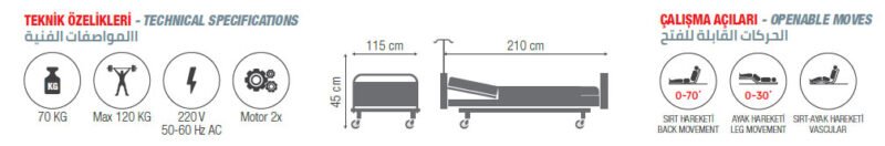 Bu yatak modelimiz tedavisi hastanede veya evde devam eden hastalarımız için tasarlanmış olup en çok satılan ürünümüzdür. Baş – Ayak hareketleri için 2 adet motor kullanılmıştır ve el kumandası ile hareketler kolayca yapılabilir. Bu modelimizin korkulukları pratik bir şekilde yukarı ve aşağı inebilmek te olup gece hastanızın düşmesini engelleyebilecek kadar sağlamdır. 120 kg ye kadar taşıma kapasitesi olan yatağımız hastanızın günlük ihtiyaçlarında büyük bir konfor alanı oluştururken refakatçi ve hasta bakıcıların iş yükünü ciddi anlamda azaltmaktadır.