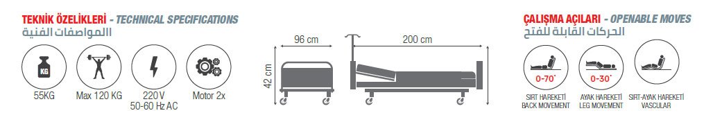 Bu yatak modelimiz tedavisi hastanede veya evde devam eden hastalarımız için tasarlanmış olup en çok satılan ürünümüzdür. Baş – Ayak hareketleri için 2 adet motor kullanılmıştır ve el kumandası ile hareketler kolayca yapılabilir. Bu modelimizin korkulukları pratik bir şekilde yukarı ve aşağı inebilmek te olup gece hastanızın düşmesini engelleyebilecek kadar sağlamdır. 120 kg ye kadar taşıma kapasitesi olan yatağımız hastanızın günlük ihtiyaçlarında büyük bir konfor alanı oluştururken refakatçi ve hasta bakıcıların iş yükünü ciddi anlamda azaltmaktadır.